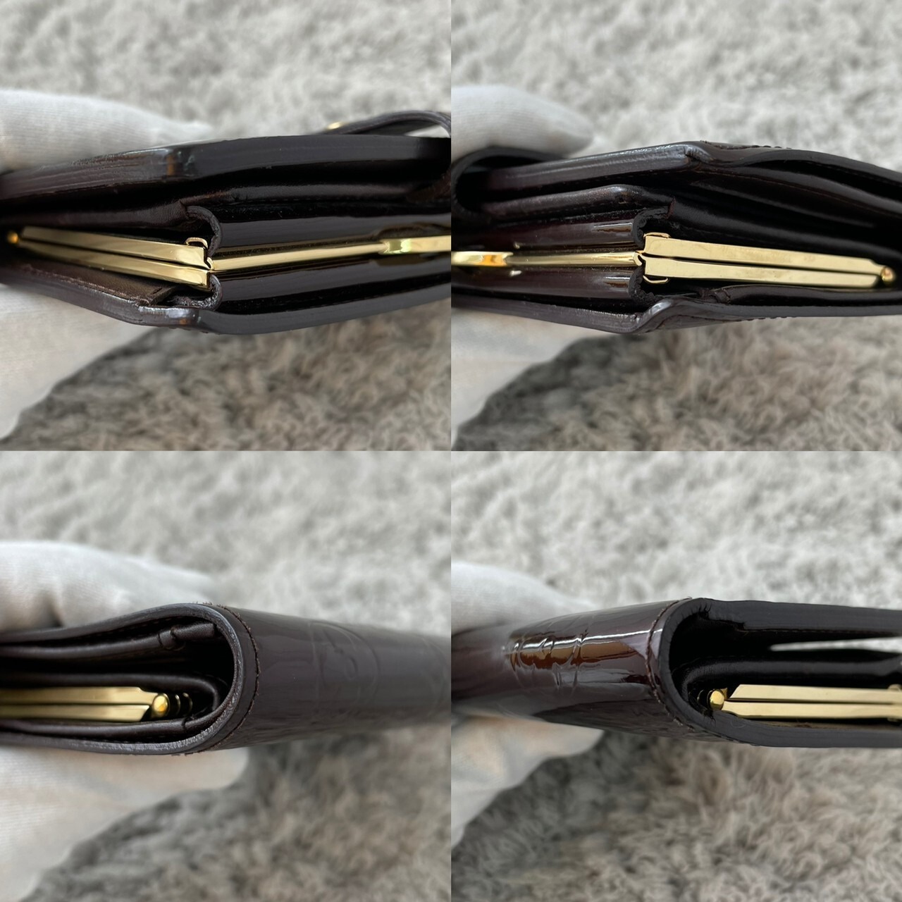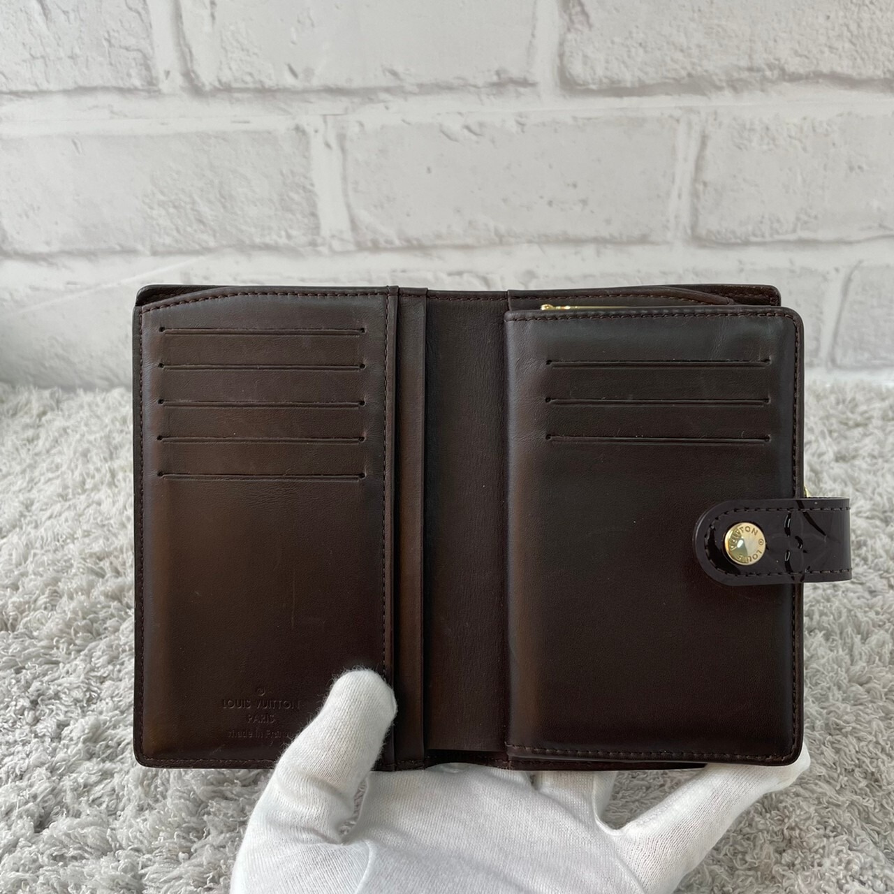 美しい光沢が魅力的なヴェルニラインの、大きく開いて中身が見やすい機能的ながま口財布。小銭がたっぷり入るがま口式小銭入れ付き。小銭がついつい増えがちな人におすすめ。※ルイヴィトン・ナビ引用