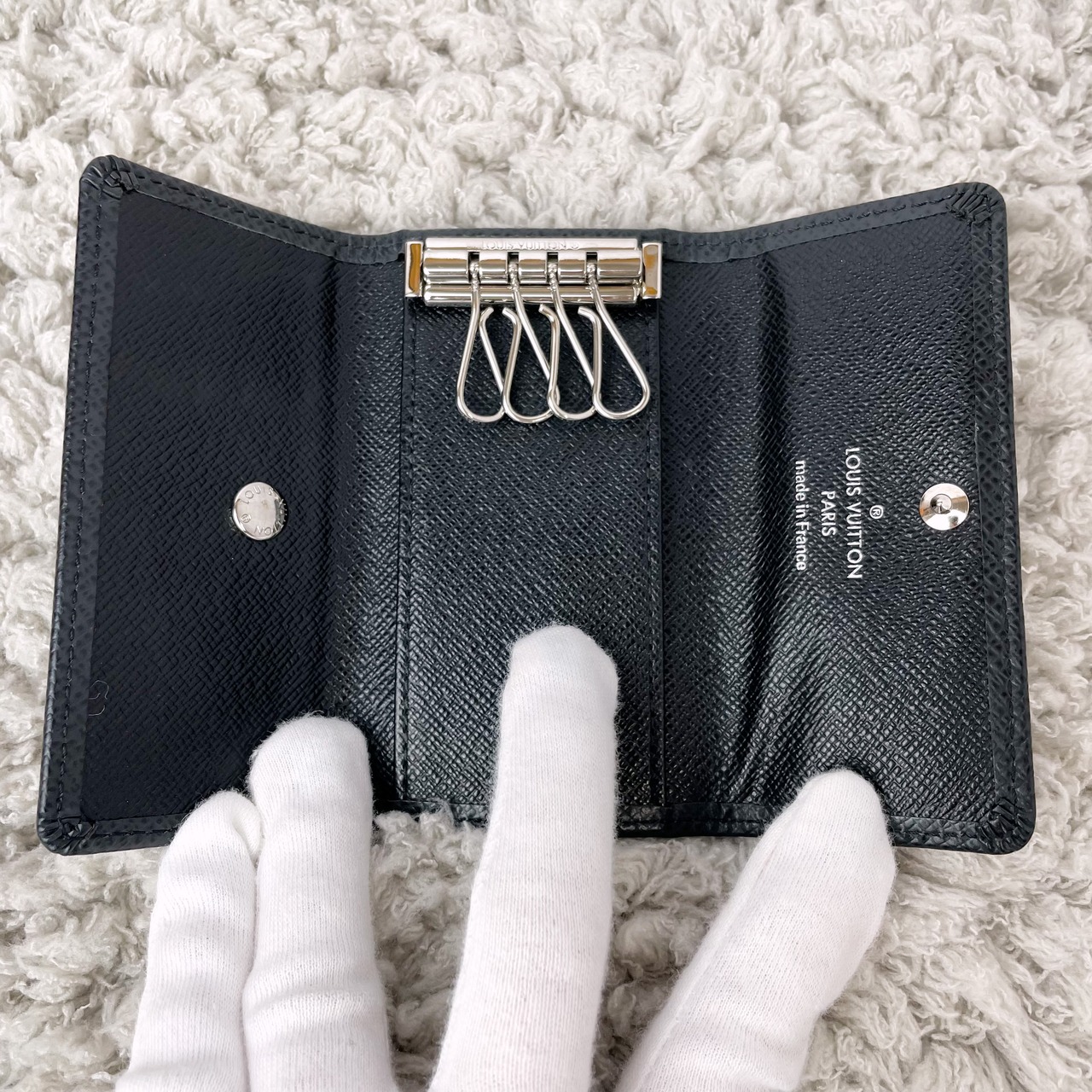 ・内側に生地浮きがございますが、大きく目立った傷や汚れもなく、とても綺麗な美品です。鍵を4本まで取り付けれるため、かさばらず持ち歩きやすいキーケースです。