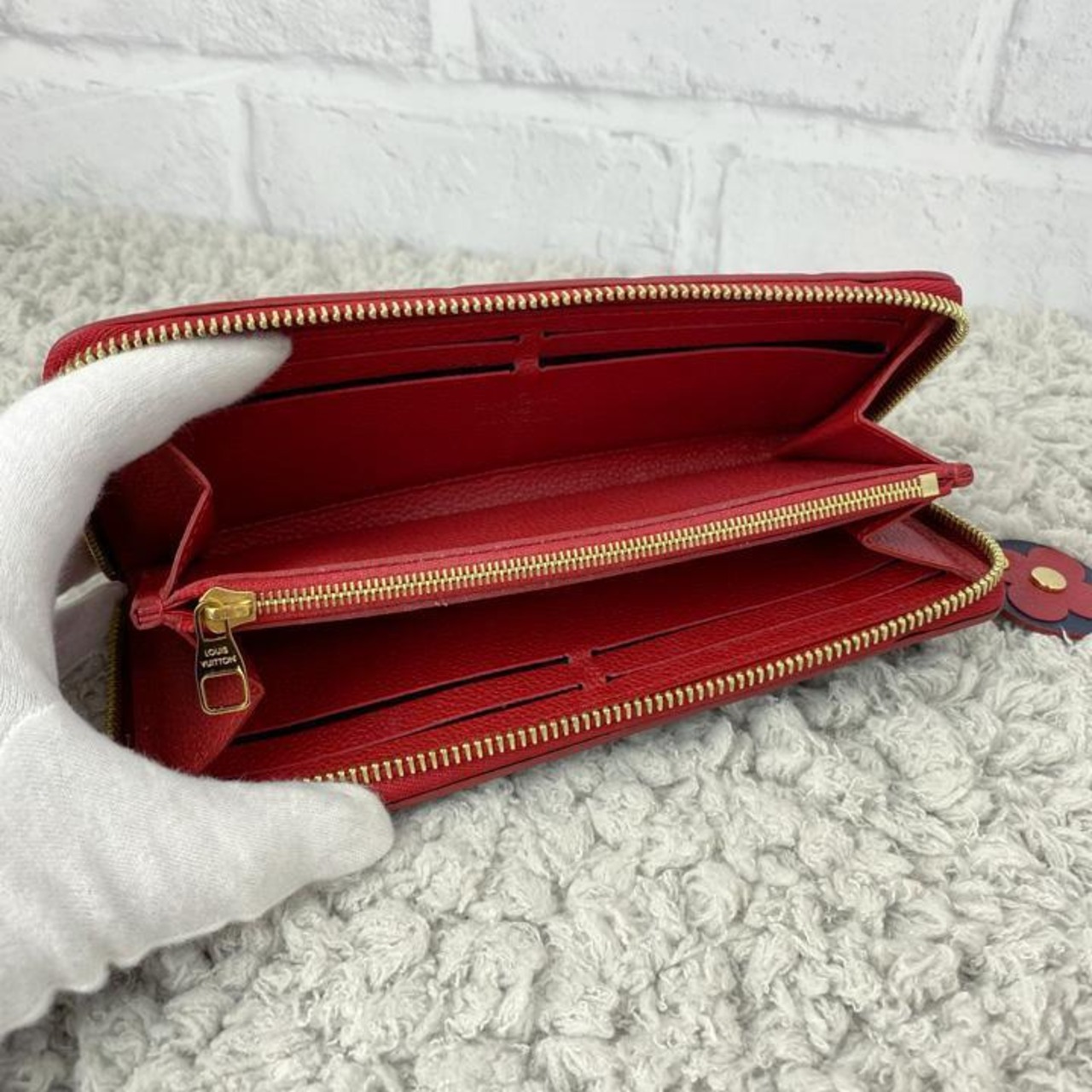 軽微な細かい傷などはございますが、内側、外側ともに綺麗な商品です。チャックの開閉もスムーズでベタつきもなく、モノグラム柄もはっきりしており、ポイントカラーの赤もしっかりしており、おすすめの美品です。