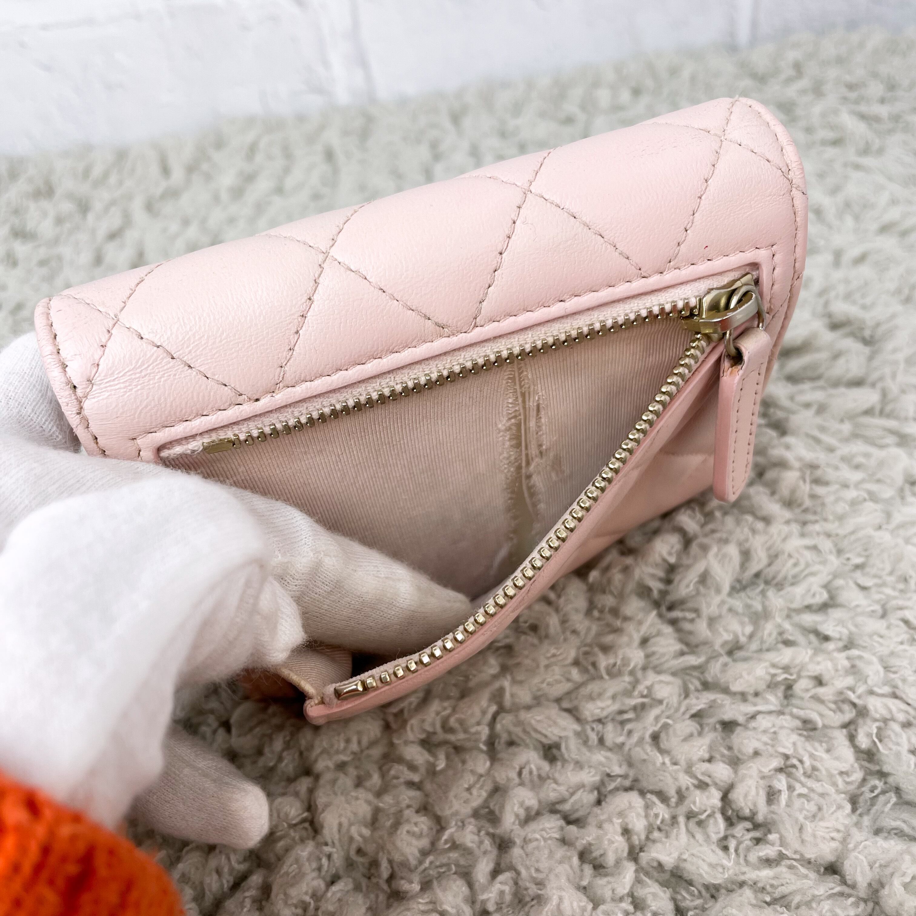 キュートなピンクカラーに、ゴールドのココマークがマッチしてとても上品な印象。外側にファスナー式の小銭入れがあり、すぐに取り出せてとても使い勝手抜群。シャネル定番のマトラッセデザインは、上品で高級感溢れる逸品です。