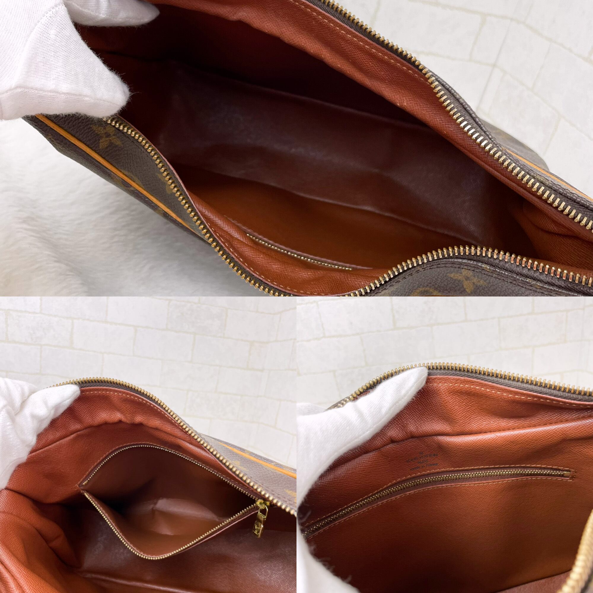 ・外側ヌメ革部分の多少の擦れと薄汚れや、ストラップの一部分に亀裂(画像8枚目上)がございますが、他は大きく目立った傷や汚れはなく、剥がれやベタつきは無ありません。ショルダー部分もしっかりしており、Ipadも持ち歩けるサイズ感です。