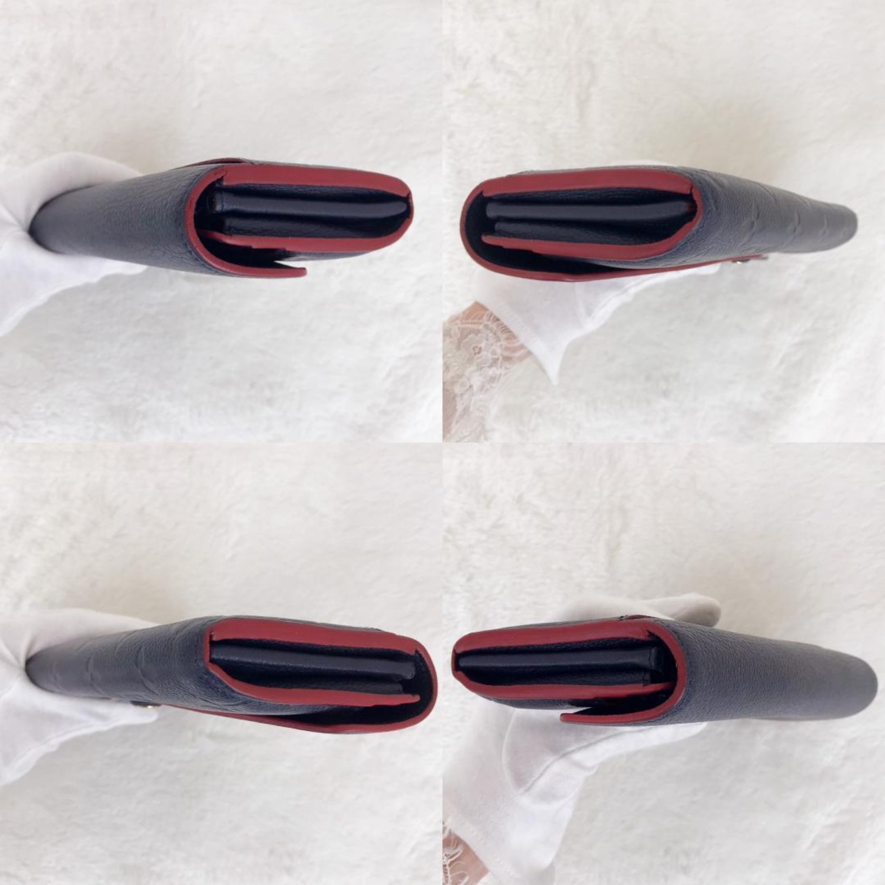 外側にカード跡、内側に金具の押し跡、コバに僅かなヒビがございますが、大きく目立ったダメージ等はなく、革の手触りも良く金具の開閉もスムーズで綺麗な商品です。マリーヌルージュはとても人気の高い商品で、バッグから取り出すだけで気分もあがります。