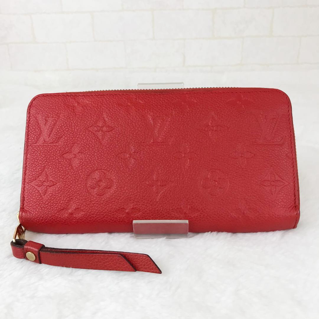 型押しされたモノグラム柄が特徴的で綺麗な赤色が目を引くモノグラム・アンプラントの長財布です。