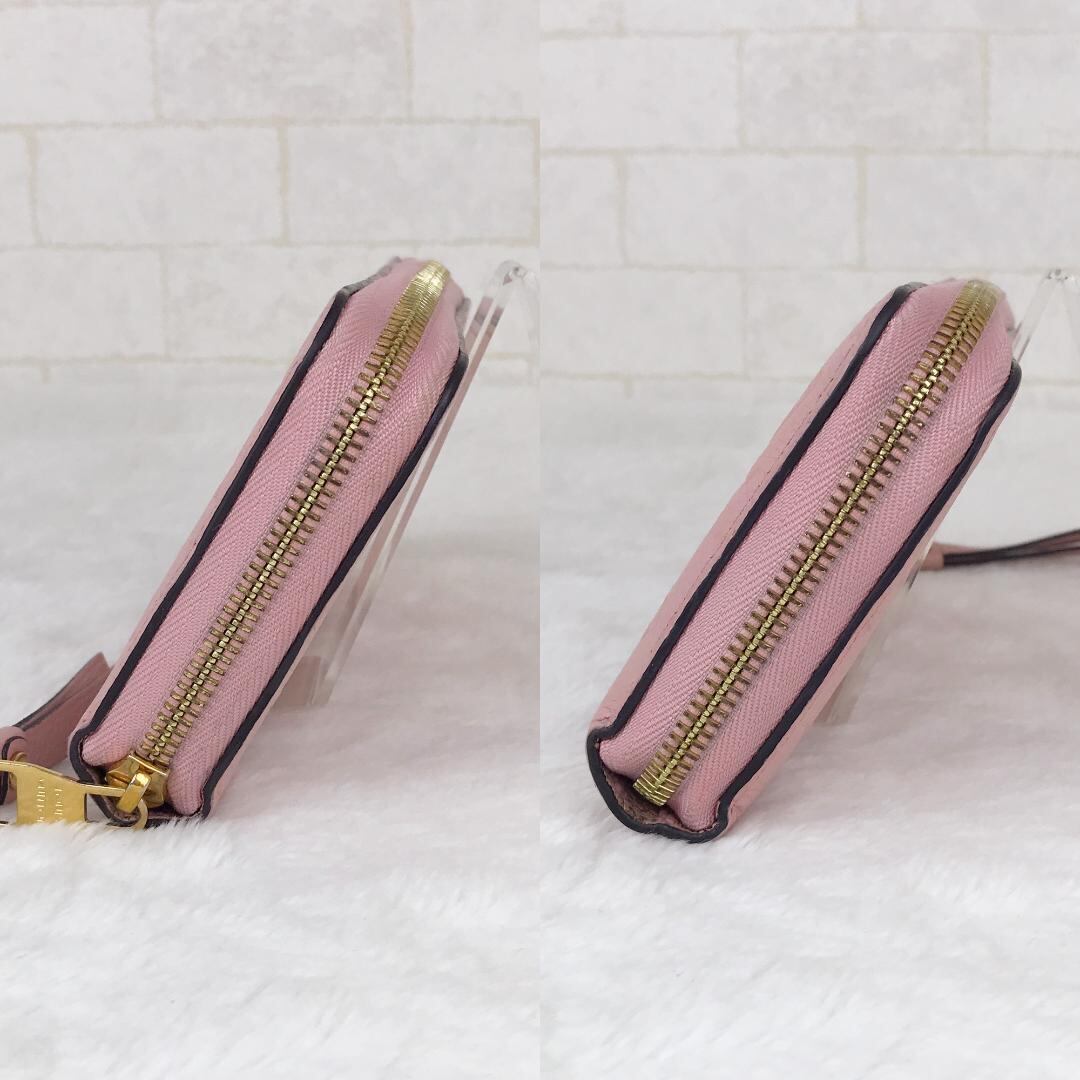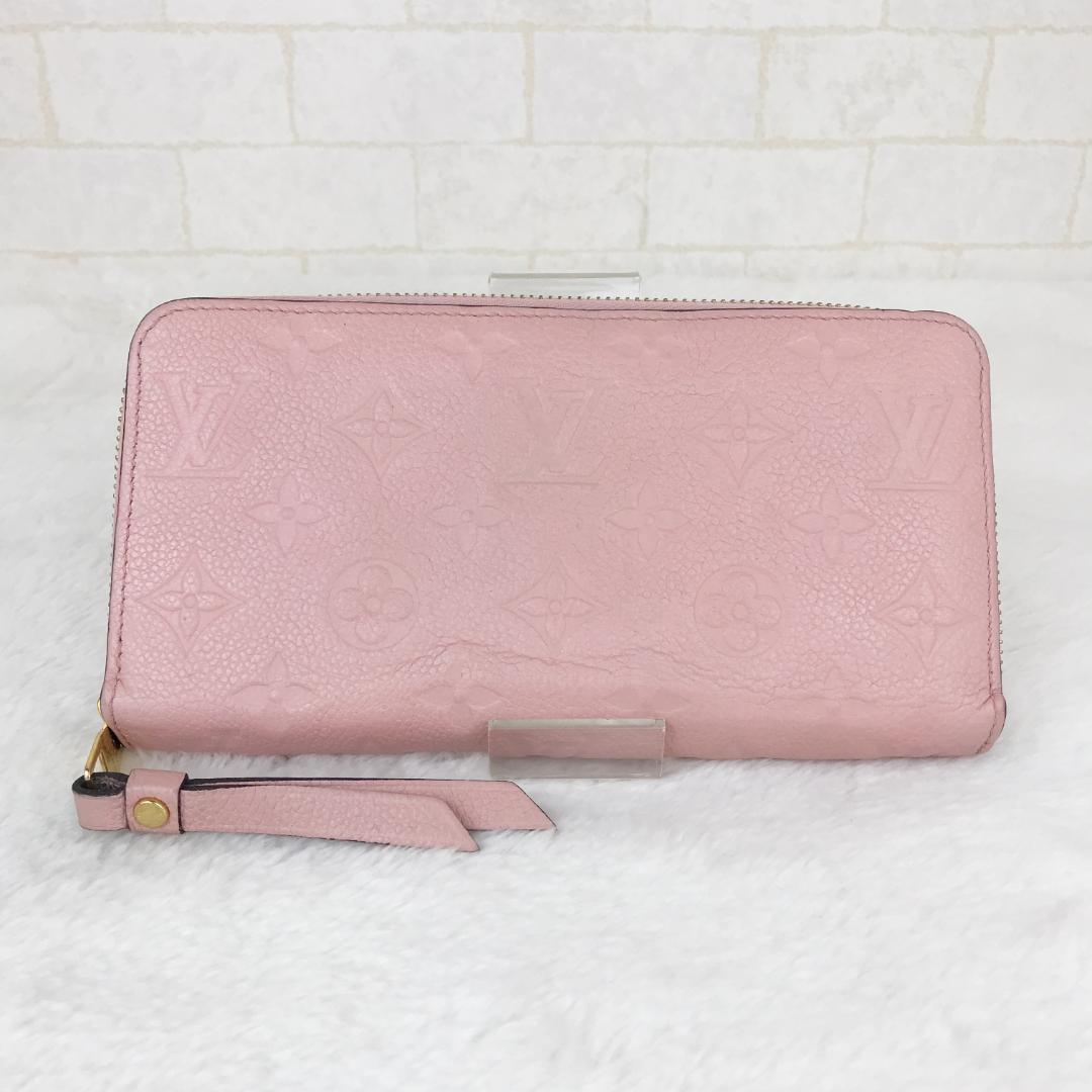 型押しされたモノグラム柄が特徴的でとてもかわいい淡いピンク色が目を惹く収納力抜群のモノグラム・アンプラント長財布です。