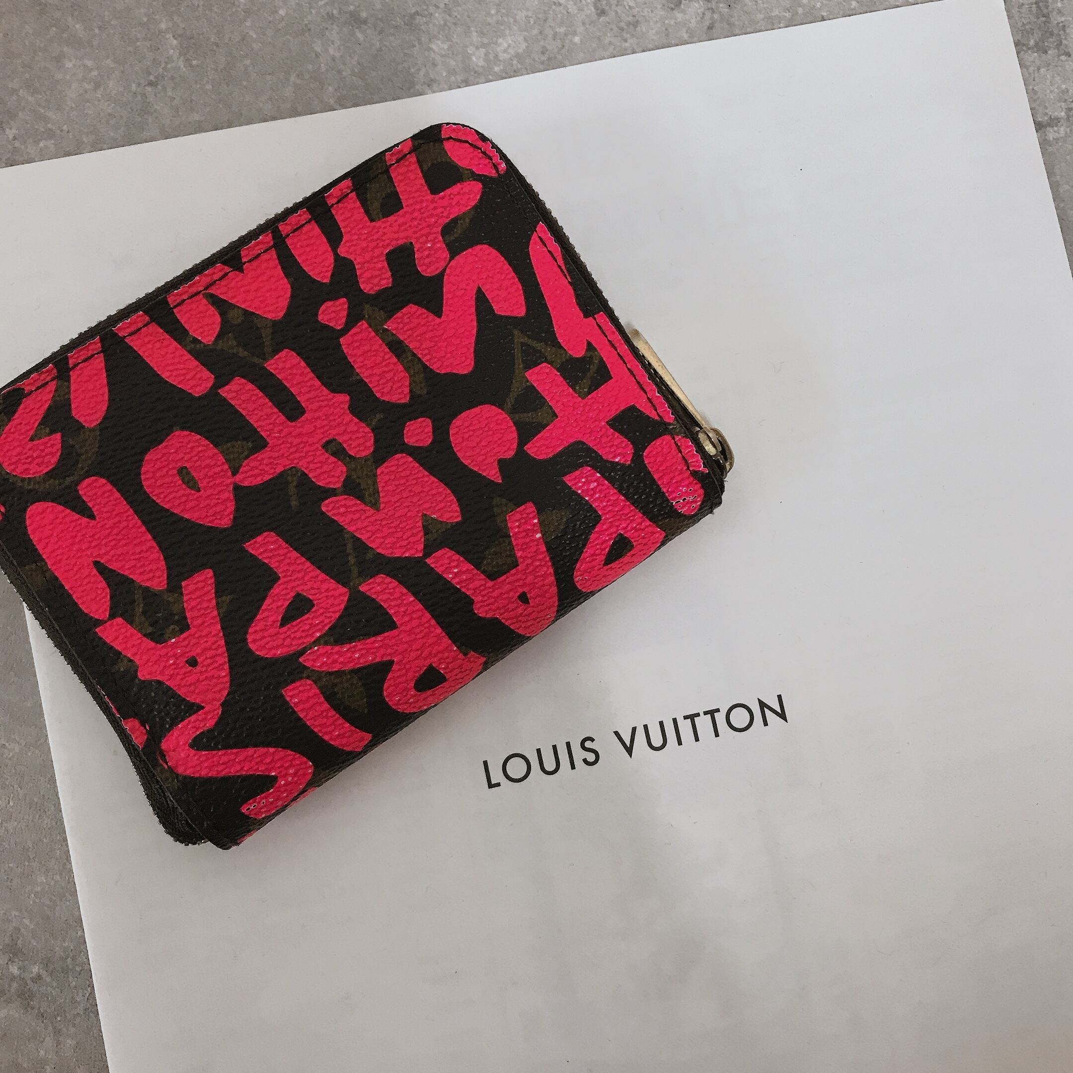 落書きのような手書きの蛍光カラーのLOUISVITTONの文字が