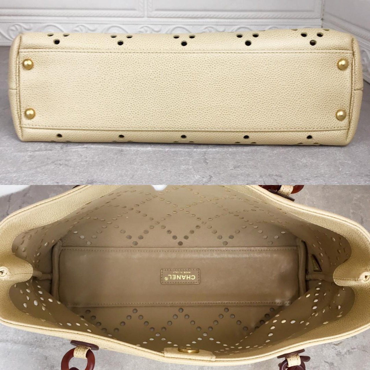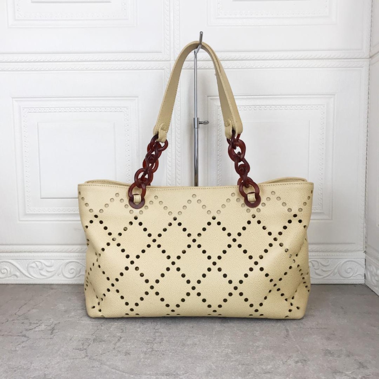 シャネルのパンチングプラチェーントートバッグです